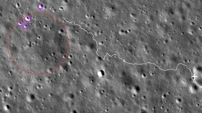 紫色圆圈区域为距离最近、反射率较亮的撞击坑,红圈为岩块位置,白线条为计划行驶路径。