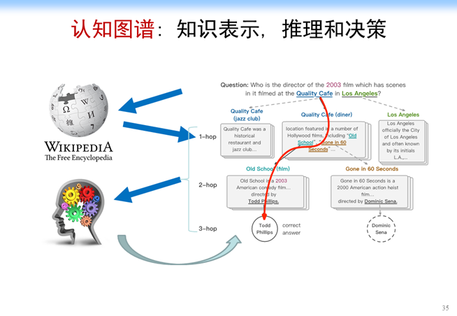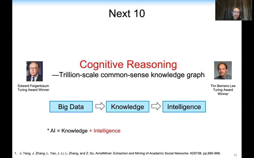 下一个十年AI最重要的一个方向就是做认知推理,它是实现大数据到知识、到智能的一个关键,这也是实现之前知识工程两个最有代表性的图灵奖获得者推崇的从知识到智能的一个关键的转变。