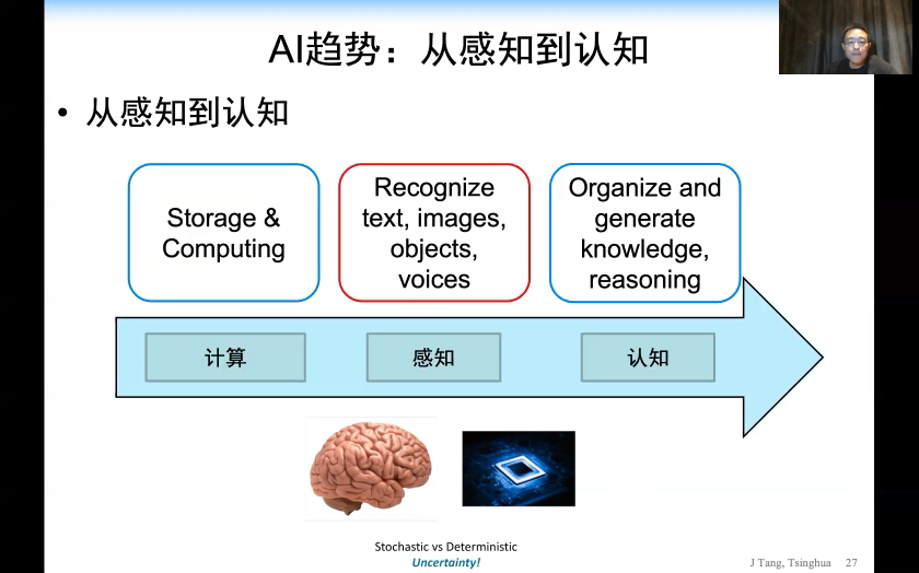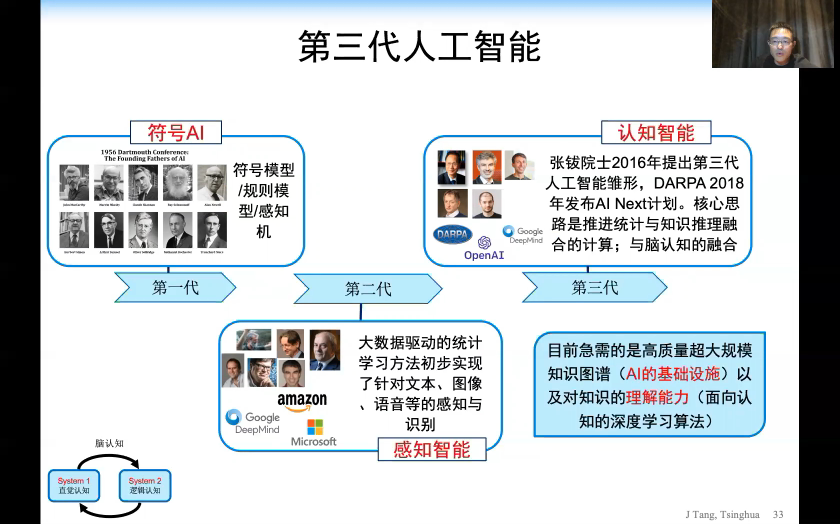 活动伊始,清华大学计算机系长聘教授、计算机系副主任、清华-工程院知识智能联合实验室主任唐杰教授以“认知推理:AI的下一个浪潮”为题做了主题报告,详细介绍了AI的发展历史、认知智能的现状及发展方向、第三代AI、意识AI等重磅前沿领域的发展,本文是AI Time对报告主要内容的简单整理,如果想要观看完整的视频报告,请在B站关注“AI Time论道”,我们已经将活动视频上传。