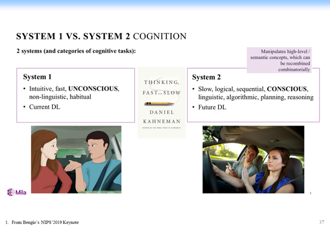总体来说,我们可以用图灵奖获得者Yoshua Bengio于2019年在NeurIPS大会中的主旨报告来总结:所有的这些模型都属于人脑认知中的System 1,也就是系统一的感知过程。