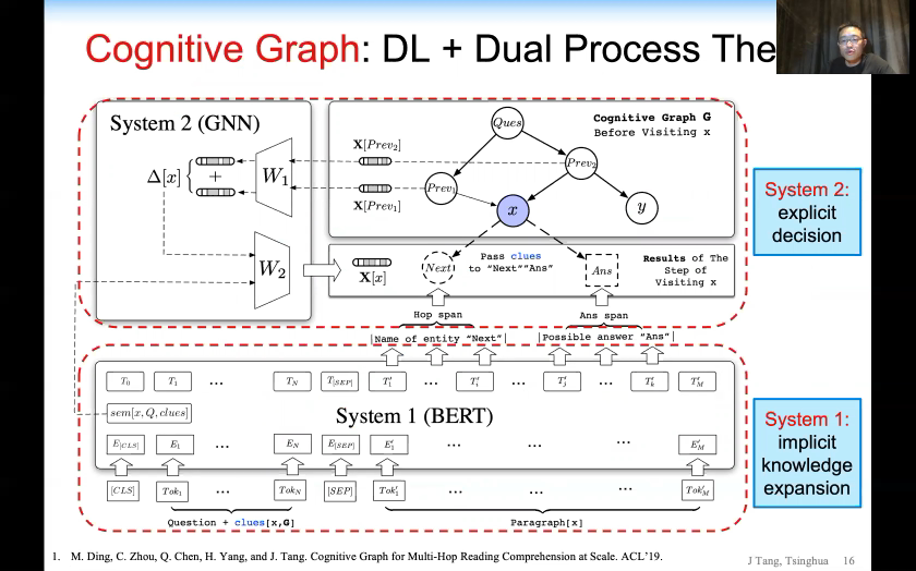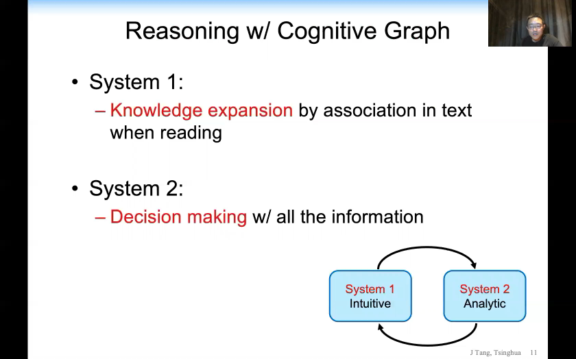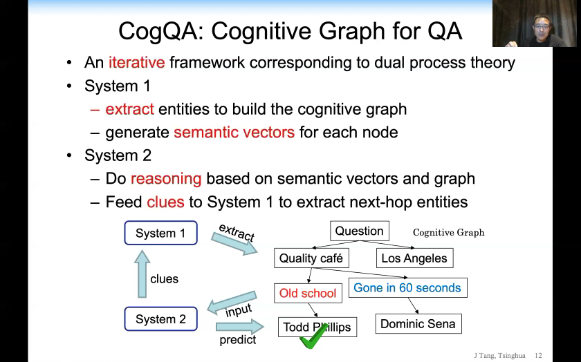 对于刚才的问题,认知图谱更加像一个迭代的过程,它里面有两个系统:一个系统对应System 1,它会抽出里面几个关键词,从外部资源中找到相关的信息,再从里面抽取出重要的信息;另一个系统对应System 2,它会判断抽取的信息是否有用,或者本身就是最终的答案。如果不是答案,但有用,System 2就会把这些相关的信息放到System 1中,而System 1会继续做这种扩展,System 2会继续做判断,最终输出我们要的答案,结束整个推理过程就,如下图所示。
