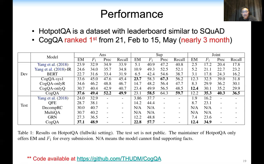 为了验证效果,我们参加了HotpotQA这个多跳、带推理的竞赛。大概在2019年2月份到5月份,我们通过把 BERT和图神经网络结合起来构造一个双通道的认知过程,最终效果相比于使用BERT的系统提高了50%,如下图所示。我们开放了相关代码,感兴趣的读者可以尝试。