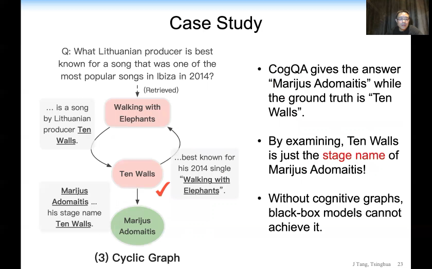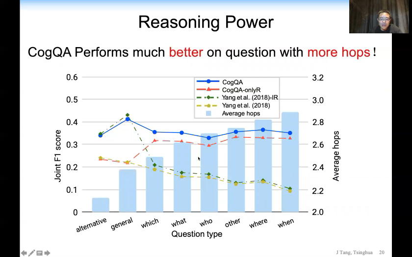 更有意思的是我们发现这个模型的推理能力很强,它可以在多跳的方面取得相对于传统方法更大的优势,如果用传统的方法且跳数(特别是推理的跳数)特别少时,传统的方法跟我们的方法相差不是特别大,但是如果推理过程、跳数很多时,我们的方法相对于传统的方法的优势就非常加明显。