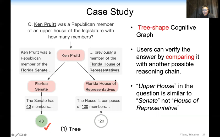还有一个优势就是在推理过程中加上这个模型以后,我们可以做反馈、做错误纠正。比如说这个问题其实是真实的一个例子,我们在这个过程中发现推理出来的结果其实是不对的,这个时候可以通过这个模型给出一个可解释性的推理路径。最后,大家可以看到在整个推理路径中看到哪些因素导致推理错误,哪些是最终使得我们推理得到目前结果的关键信息,这个时候用户可以通过这样的一个推理路径来识别和判断产生推理错误的原因。
