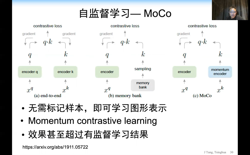 最近在图形上还有一些自监督学习,比如何恺明等人在2019年提出的MoCo,这时候自监督模型的分类结果可能比有监督学习的结果还要好。
