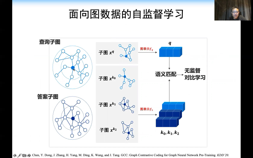 我们在这个idea的基础上做了图形化数据的直接学习,这是我们今年做的一个工作。我们给定一个图、一个网络以后,可以在网络的基础上自动找到网络的正例,比如说对于当前节点可以通过一个随机游走找到一个子图,我们把它叫作查询子图,同时在这个节点上再做一次随机游走,这时候肯定会找到另外一个不相关、不完全一样、但是跟刚才的子图非常相似的子图,我们把两个字图匹配形成的度叫作正力度。同时,我们在网络中随机找到另外一个节点,然后从这个节点上随机做一个子图的随机游走,这时候形成了另外一个子图和查询子图,形成匹配,我们就这个叫做负力。通过正力、负力,我们就可以做一个对比学习。最终我们通过这样的方法就可以构造一个图形化数据的自监督学习模式,这样的模型就可以大大增强认知推理过程中System 1快速匹配的过程。