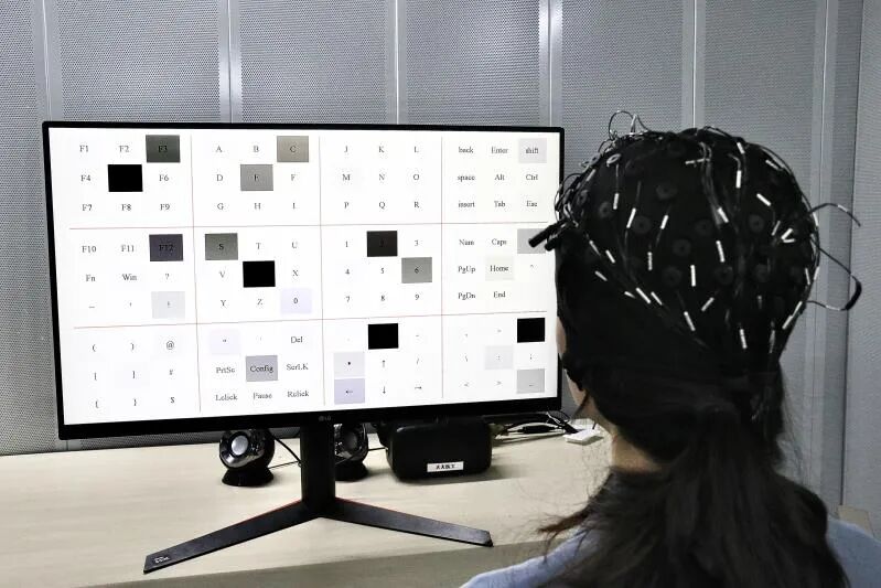 许敏鹏进一步解释:“简单来讲,就是我们会在屏幕上呈现一个虚拟的键盘,键盘中的每个字符背后都有一套特定模式的视觉刺激。当你想拼写某个字符的时候,你只要看着这个字符就行。字符背后的视觉刺激就会让你的大脑诱发出特定模式的脑电波,然后通过算法解码脑电波模式,就能确定你看的是哪个字符。这就是现有脑-机接口打字的基本原理。”