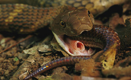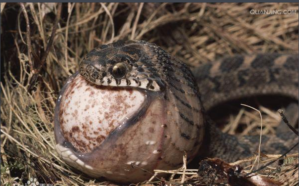 大家可能都知道蛇的吞食能力很强,能够吞下比自己大的猎物。例如,蟒蛇吞食各种比它头还大的动物,有些毒蛇则是通过毒液先把一些大型猎物毒死,然后再吞食。食卵蛇则能将比自己头大的鸟卵整个吞下,把蛋在体内弄破后再将破碎的蛋壳吐出。