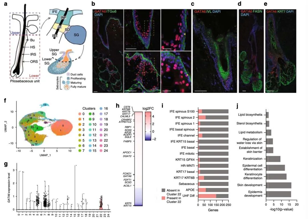 GATA6蛋白在人类皮肤的上层毛囊皮脂腺单位中表达。图源:《自然·通讯》在线版