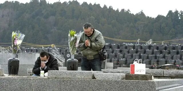 资料图:在日本福岛县双叶,人们在墓碑前祈祷,身后码放的黑色塑料袋里装着被核辐射污染的垃圾。图源:新华社