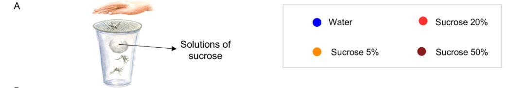 研究人员正是因为看到了这一点,觉得可以利用蚊子喜欢糖这一特性来减少它们吸血的冲动。所以研究人员立即开展试验,他们准备了一些覆盖有网的透明塑料杯,把蚊子分别关进这些杯子里,杯子里都挂着一个棉球,有的杯子里的棉球是浸了糖水的(浓度分别为5%、20%、50%),有的则是普普通通的水,这样方便作对比。