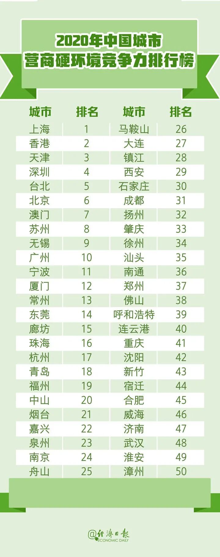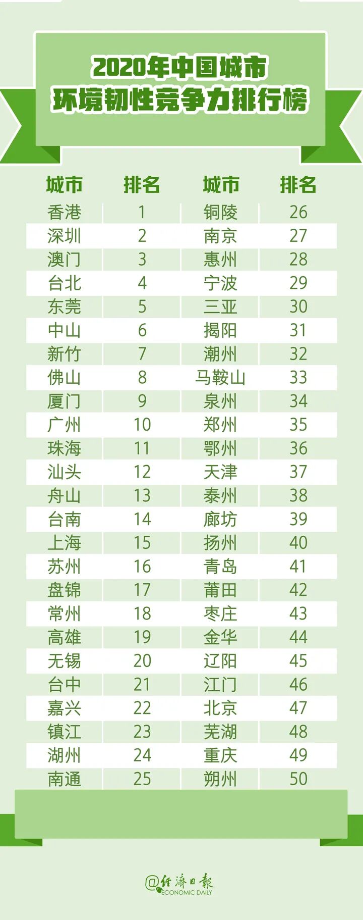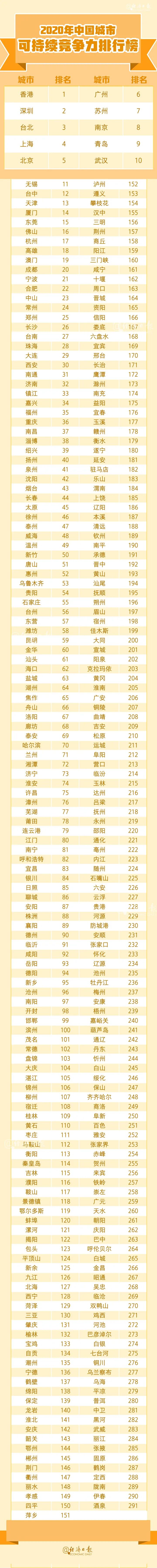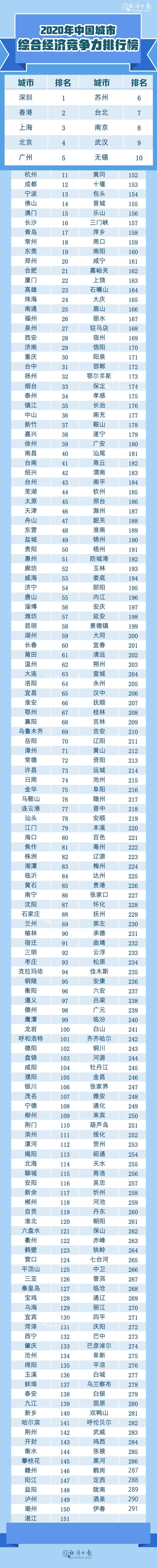 报告显示,2020年城市综合经济竞争力指数10强依次是:深圳、香港、上海、北京、广州、苏州、台北、南京、武汉和无锡。2020年中国可持续竞争力指数10强依次是:香港、深圳、台北、上海、北京、广州、苏州、南京、青岛和武汉。