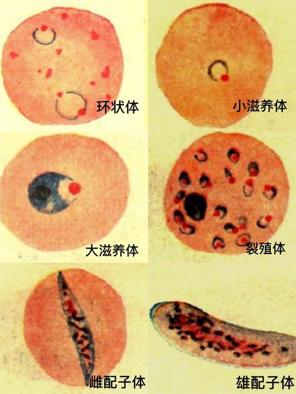 恶性疟原虫各个时期形态(图片来源:https://wenku.baidu.com/view/10a32705b52acfc789ebc96f.html?sxts=1560834925481)
