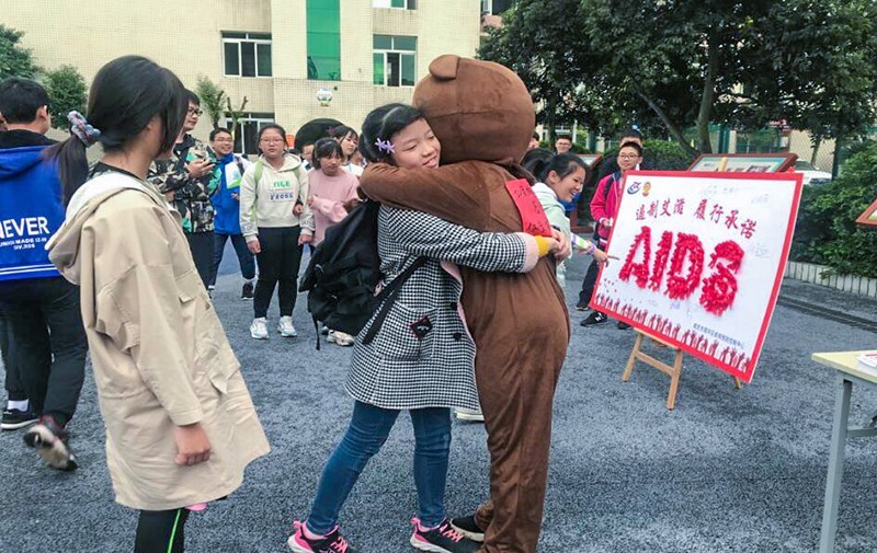 现场,防艾志愿者通过海报宣传展示、发放宣传手册、承诺签名及红丝带张贴等形式开展活动,现场气氛热烈。此外,活动中还设有“爱的抱抱”环节,通过与贴有“我是艾滋病患者,可以抱抱我吗”字样的大熊相互拥抱,现场气氛一片火热。来自高一的小梦说:“这个活动很有意义,也很有爱。希望更多的人能理解和尊重艾滋病病人。”