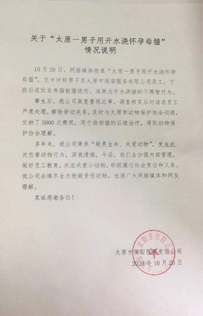 这名男子的工作单位太原市保安服务有限公司对此做出回应,表示已跟其解除劳动关系,并与太原市动物保护协会沟通交纳了5000元费用用于猫的后续治疗。这便是虐杀怀孕母猫、造成一尸五命的人目前受到的“惩罚”。对比他的恶行:当街施暴,把猫锁在笼子里,拿着刚烧开的100度水往猫身上浇,口里说着“要往死里整它”,至今也未道歉……实在是无法平息公众的愤怒。