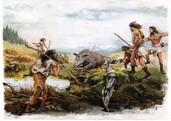 5200年前青藏高原东北部马家窑文化先民狩猎印度野牛的场景复原图。绘制/张海岩