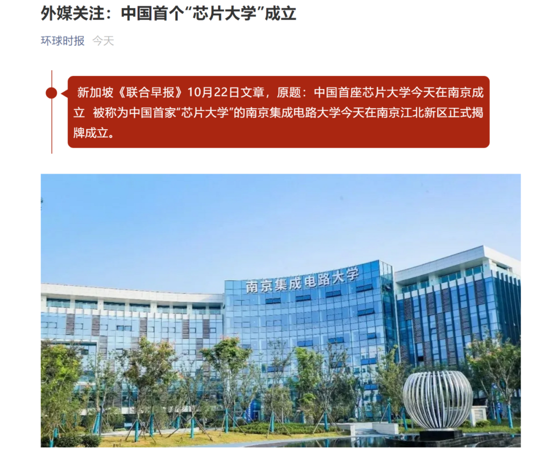 新加坡《联合早报》10月22日发文称,中国首座芯片大学在南京成立。