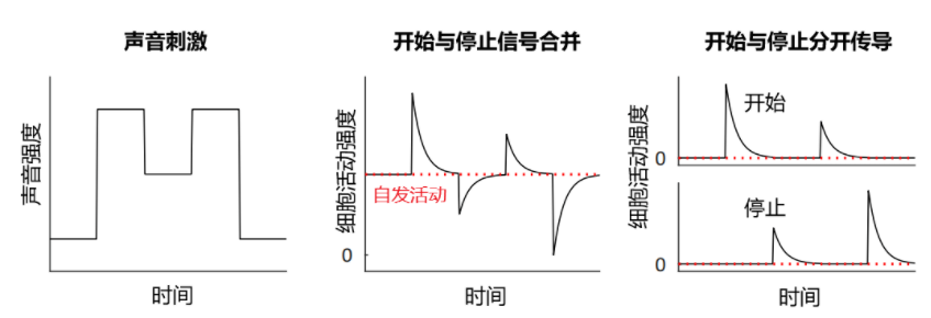 左图-声音强弱变化;中图-自发活动强度(红线)高,才能同时传递两类信息,消耗能量多;右图-分开传导,仅需很低自发活动强度,节省能量丨参考文献[1]