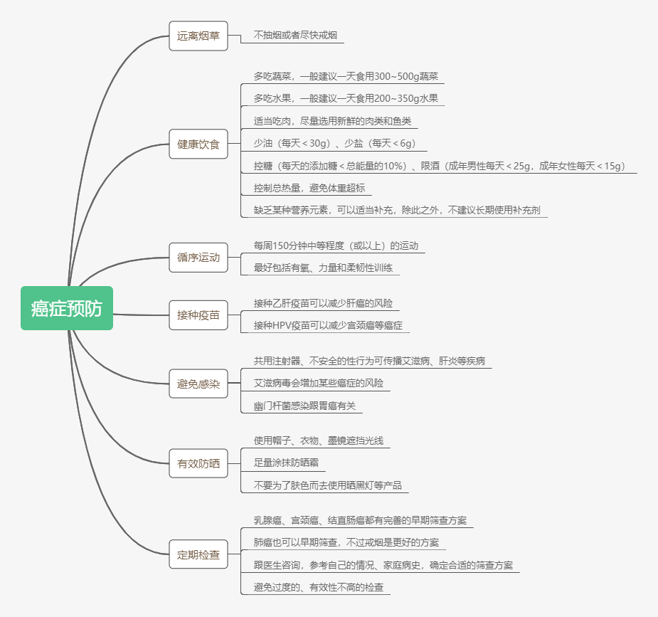 预防癌症的方法,图片来源:作者自制(点击可看大图)[1] 中国营养学会. 中国居民膳食营养素参考摄入量(2013版)[M/OL]. 科学出版社, 2014[2020–07–23]. https://book.douban.com/subject/26813060/.[2] 胡盛寿. 中国心血管病报告[J]. 国家心血管病中心, 2019: 1–234.[3] 中华人民共和国国家卫生健康委员会. 流行性感冒诊疗方案(2019年版)[EB/OL](2019–11–13)[2020–10–20]. http://www.nhc.gov.cn/.[4] ALLAN G M, ARROLL B. Prevention and treatment of the common cold: making sense of the evidence[J]. CMAJ : Canadian Medical Association Journal, 2014, 186(3): 190–199. DOI:10.1503/cmaj.121442.[5] 金伯泉. 医学免疫学[M/OL]. 人民卫生出版社, 2008[2020–10–21]. https://book.douban.com/subject/3160265/.[6] CONSORTIUM W S trial, PAN H, PETO R, 等. Repurposed Antiviral Drugs for COVID-19 –Interim WHO SOLIDARITY Trial Results[J]. MedRxiv, 2020: 2020.10.15.20209817. DOI:10.1101/2020.10.15.20209817.[7] CHANG C C, CHENG A C, CHANG A B. Over‐the‐counter (OTC) Medications to Reduce Cough as an Adjunct to Antibiotics for Acute Pneumonia in Children and Adults[J/OL]. Cochrane Database of Systematic Reviews, 2014(3)[2020–10–21]. https://www.cochranelibrary.com/cdsr/doi/10.1002/14651858.CD006088.pub4/full?highlightAbstract=cough%7Choney. DOI:10.1002/14651858.CD006088.pub4.[8] ODUWOLE O, UDOH E E, OYO‐ITA A, 等. Honey for Acute Cough in Children[J/OL]. Cochrane Database of Systematic Reviews, 2018(4)[2020–10–21]. https://www.cochranelibrary.com/cdsr/doi/10.1002/14651858.CD007094.pub5/full?highlightAbstract=cough%7Choney. DOI:10.1002/14651858.CD007094.pub5.[9] JING W, HONGLAN L, XIAO M, 等. A nested case-control study of cruciferous vegetables intake, urinary isothiocyanates level and lung cancer risk among men in urban Shanghai: 8[J]. Chinese Journal of Preventive Medicine, 2018, 52(8): 816–821. DOI:10.3760/cma.j.issn.0253-9624.2018.08.008.[10] 中国营养学会. 中国居民膳食指南(2016)[M/OL]. 人民卫生出版社, 2016[2020–07–23]. https://book.douban.com/subject/26795949/.[11] ROCK C L, THOMSON C, GANSLER T, 等. American Cancer Society Guideline for Diet and Physical Activity for cancer prevention[J]. CA: A Cancer Journal for Clinicians, 2020.[12] REYNOLDS A, MANN J, CUMMINGS J, 等. Carbohydrate Quality and Human Health: A Series of Systematic Reviews and Meta-Analyses[J]. The Lancet, 2019, 393(10170): 434–445. DOI:10.1016/S0140-6736(18)31809-9.审核专家:阮光峰,食品与营养信息交流中心科学技术部主任