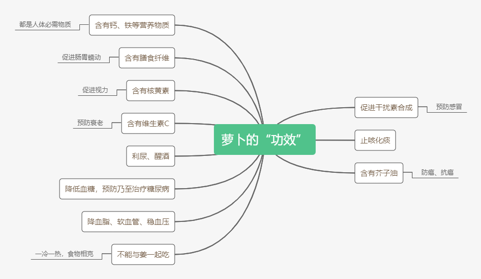 胡萝卜,图片来源:pixabay.com萝卜传言中的功效非常多,我在这里画了一张图进行总结。这其中很多“功效”,根本没有必要进行讨论。比如萝卜是含有钙、膳食纤维、核黄素,其他食物也有啊,老实说萝卜的含量根本不算突出;[1]比如,萝卜可以降血脂、软血管、稳血压——国家心血管病中心2019年发布的《中国心血管病报告》中,没有提到任何一种特定的蔬菜,只是说“要多吃水果和蔬菜”。[2]富含核黄素(维生素B2)的食物,图片来源:《中国居民膳食营养素参考摄入量(2013版)》剩下三个“功效”可能大家比较关心:预防感冒、止咳化痰和防癌抗癌。笔者为您一一分析。普通感冒、流行性感冒都是由病毒引起的,而预防病毒感染的办法总共三个:一是接种对应的疫苗,当然前提是有对应的疫苗可用;二是注意自身防护,没接触到病毒就没什么好担心的;三是对于流行性感冒,如果没有接种过疫苗又存在重症风险(比如老人、小孩、孕妇、肥胖者,或存在基础疾病者),可以在接触病毒的48小时内服用奥司他韦和扎那米韦等抗病毒药物进行预防。除此之外,不管是特定食物还是营养元素都帮助不大。[3,4]网上流传一种说法:萝卜可以刺激机体产生干扰素,从而预防病毒感染——更是没影子的事儿。干扰素是细胞在受到病毒侵袭之后合成的特殊蛋白质,可以干扰病毒的复制,从而保护周围的细胞不受感染。[5]换句话说,要想让人体合成干扰素,一方面需要病毒刺激,另一方面需要遗传基因参与;跟吃什么几乎没有关系,何况萝卜的主要成分是水,占到了九成以上。再者,干扰素和人体其他成分一样,不是越多越好,而是和谐才好。医生不会一见到病毒感染就用干扰素,真要用的时候必须十分小心时机和剂量;因为疾病的复杂性,有时候用了未必有效果。拿大家非常关心的新型冠状病毒为例,世界卫生组织的研究显示,干扰素对新冠死亡率几乎没有影响。[6]出现咳嗽、吐痰,第一时间去医院看看是不是疾病引起的。如果是,及时接受治疗;如果不是,可能是空气干燥的缘故——室内加湿或多喝汤水,很快就会好。我们的呼吸道上有许多纤毛,其作用跟拖把差不多,借助身体分泌的液体将灰尘等物质包裹起来,形成常说的痰液;而咳嗽正是排出痰液的主要方式。换句话说,咳嗽跟发烧差不多,都是人体应对不良刺激的一种手段。非要止住咳嗽,反而对身体不好。如果咳嗽非常严重,那么,药物是第一选择,除此之外,唯一值得尝试的是蜂蜜。研究显示,蜂蜜具有一定的止咳效果。[7,8]萝卜以及许多十字花科蔬菜含有一种特殊的物质,叫做异硫氰酸盐(Isothiocyanate,ITCs)。类似的物质最早在芥子油的种子中发现,因而也叫芥子苷。不知道怎么在网络传播的过程中就变成了“芥子油”……