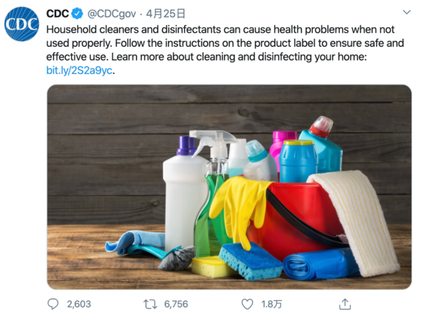 与此同时,各州的卫生部门正苦口婆心地告诫居民不要注射/服用消毒剂,甚至美国疾病控制与预防中心(CDC)也发了声: