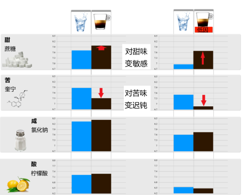 咖啡对味道的影响,在不同性别中没有区别,但与平时喝咖啡的量相关。很少喝的人饮用咖啡之后,对苦味的敏感程度降低更多,对甜味的感受与常喝咖啡的人相似。