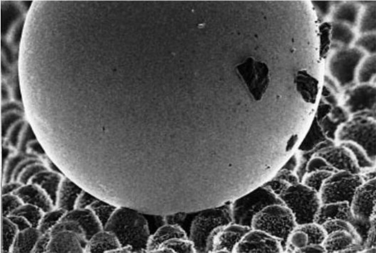 图片内容:荷叶表面的乳突形成的山峰和山谷,以及荷叶上的水珠和水珠上粘黏的污垢(图片来源:参考文献[3])
