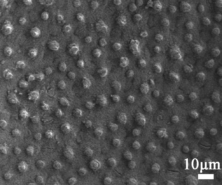 当放大到10000倍时,可以进一步看到平行的脊脉之间,不规则地排布着类似蜂窝状的凹坑结构,脊脉间的距离大概为1.8微米,蜂窝状凹坑的尺寸大致为0.9微米。