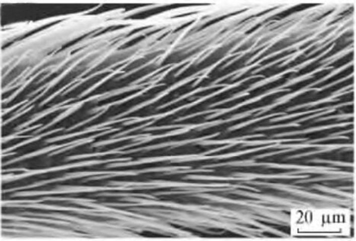谜底就藏在水黾的腿部。当把水黾的腿放大来看时,可见他的腿上均匀排列着长度在20微米左右的刚毛。