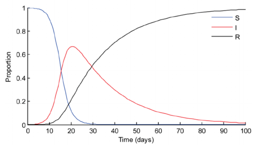 微分方程解出来的结果不一定能用数学式子来表示,一般来说我们更习惯用下面这样的图像表示SIR模型的传染趋势:横轴代表时间,纵轴代表群体的人数。你可以很直观的看到,I代表的感染者数量随时间迅速增长,S代表的易感者相应变少,最后的结果是大部分被“移除”了(可能是治愈或者是病死),不再存在感染者。