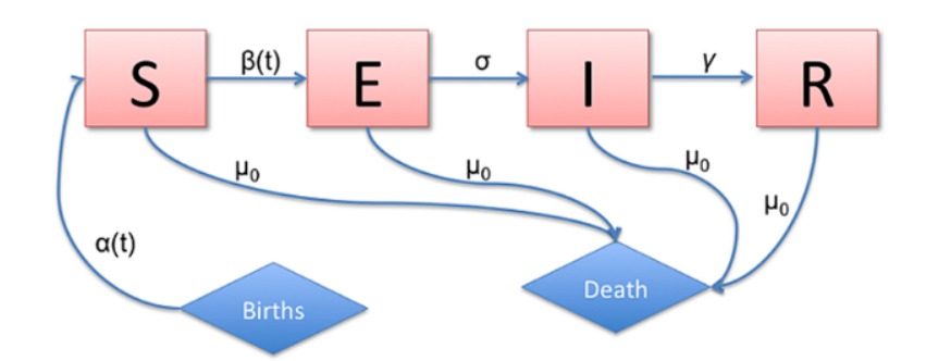 SEIR模型图示 E代表 Exposed 潜伏者 | 参考资料[6]