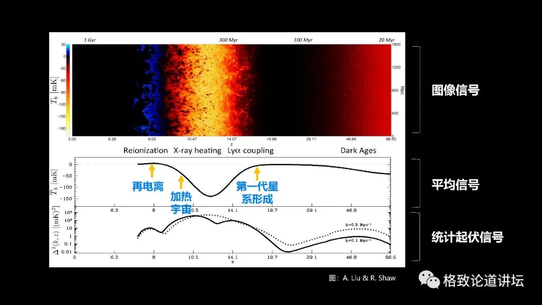 这些信号,它各自有各自的特征,那么放在一起我们就能够对宇宙从第一代星系的形成进入到宇宙的黎明,再到宇宙开始加热,再到最后开始电离整个过程,有一个非常清晰的图像。