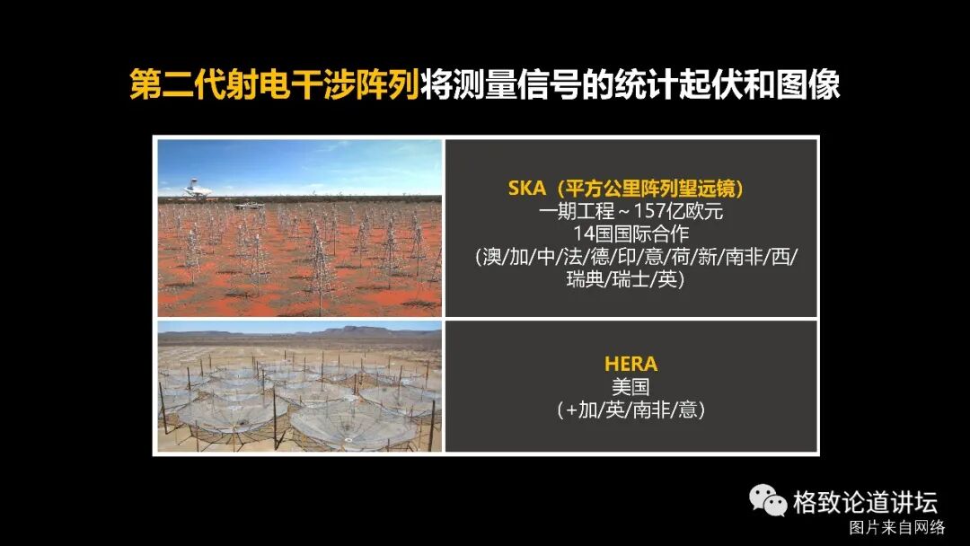 同时,SKA就是中国参与的这个实验,它的灵敏度更高,它能够看到来自再电离时代的图像信息,那么这个图就总结了一下。