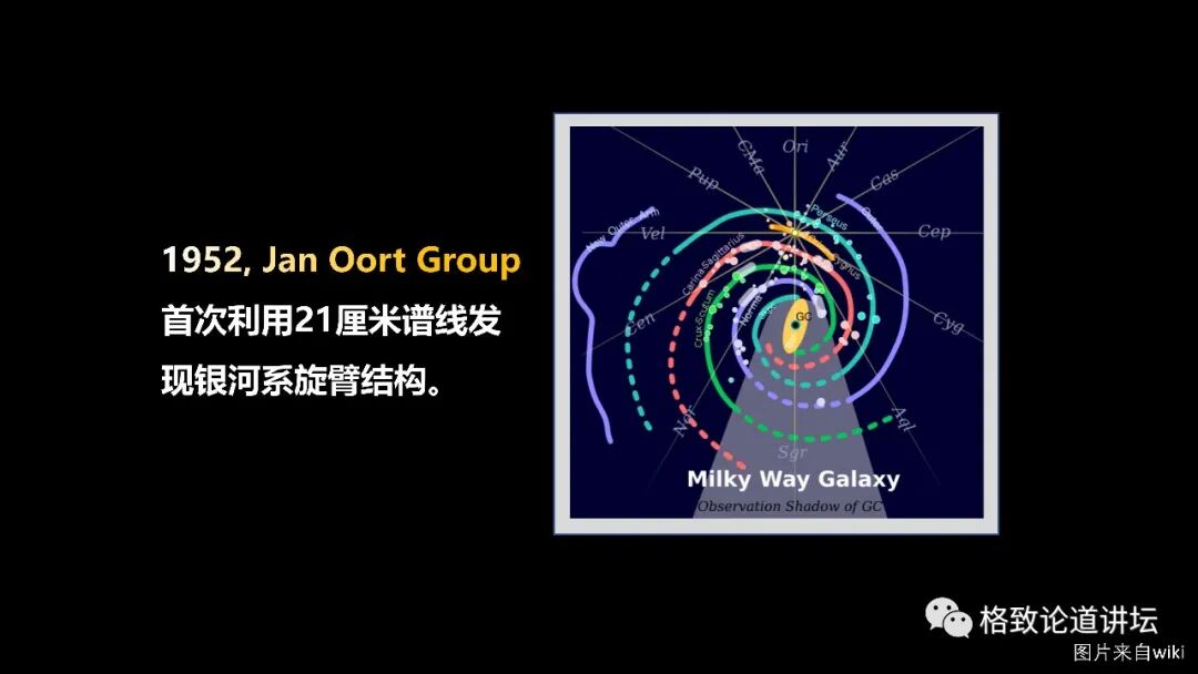 但是荷兰科学家,在这个方向上是继续发展第二年他们组就首次利用21厘米谱线,做出了一个重大发现,发现了银河系的旋臂结构。