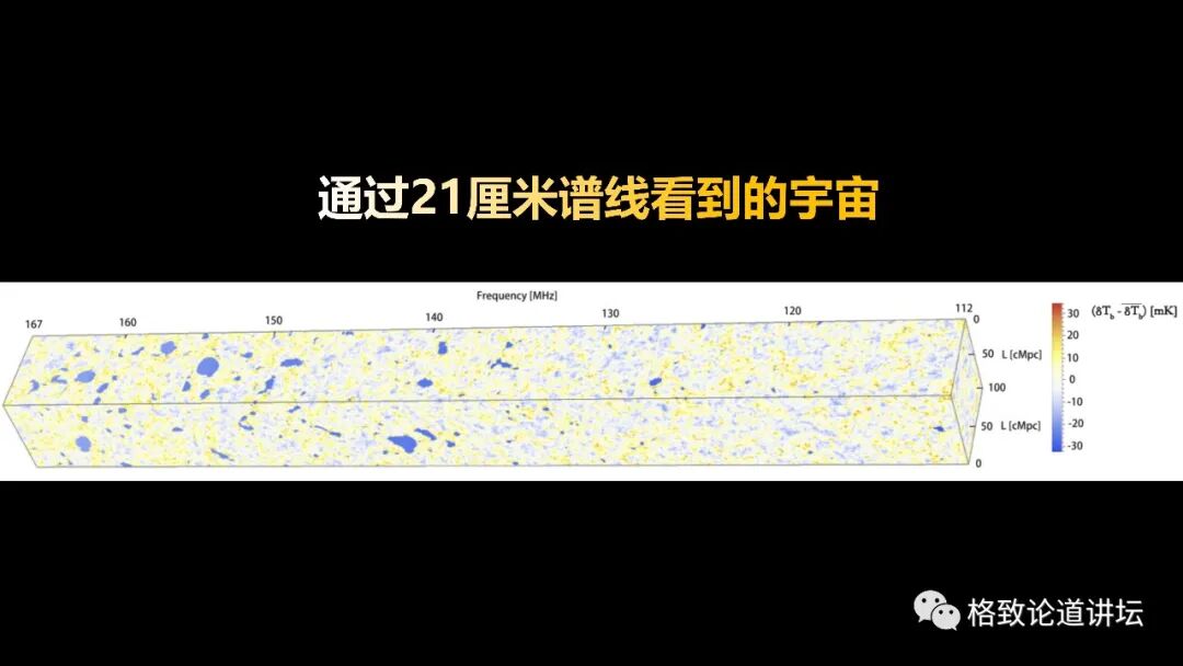 它有21厘米,我们可以通过21厘米谱线看到它的样子,原则上我们能够重现出宇宙。