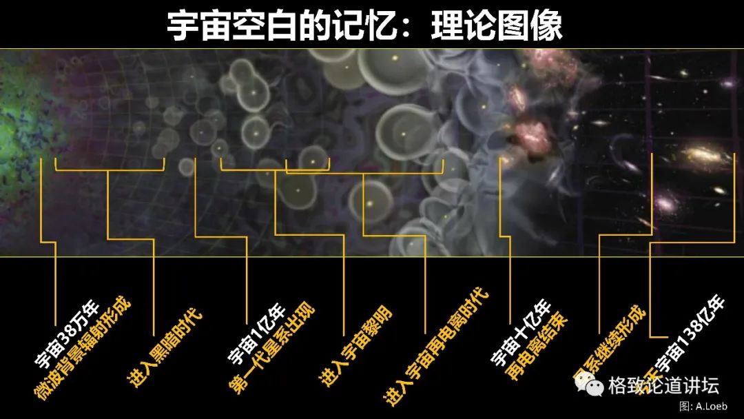 一开始中性到慢慢出现了第一代星系,形成了这些泡状的电离氢的区域。再到后来,宇宙慢慢全部被电离的这个整个的过程。