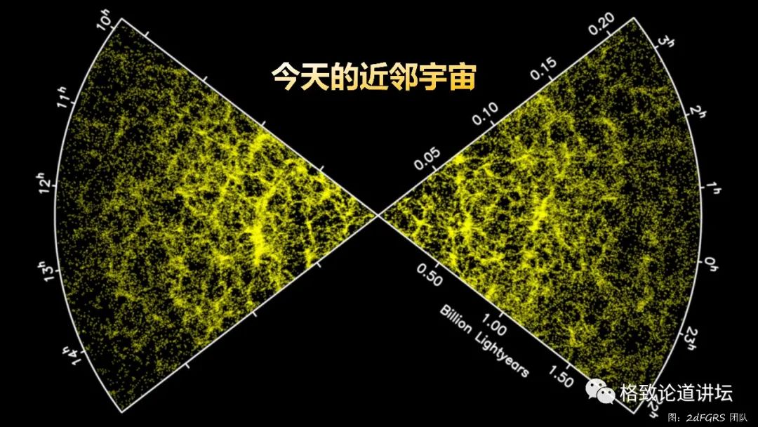 也可以通过星系巡天看到在今天近邻宇宙的各种星系、各种非线性的结构。但是我们还缺乏观测手段。