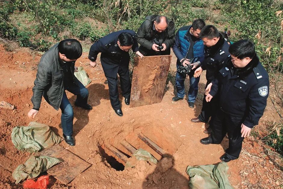 2014年3月,湖南常德临澧县公安局民警和临澧县文物局执法大队工作人员在被盗墓穴现场勘查。图/新华