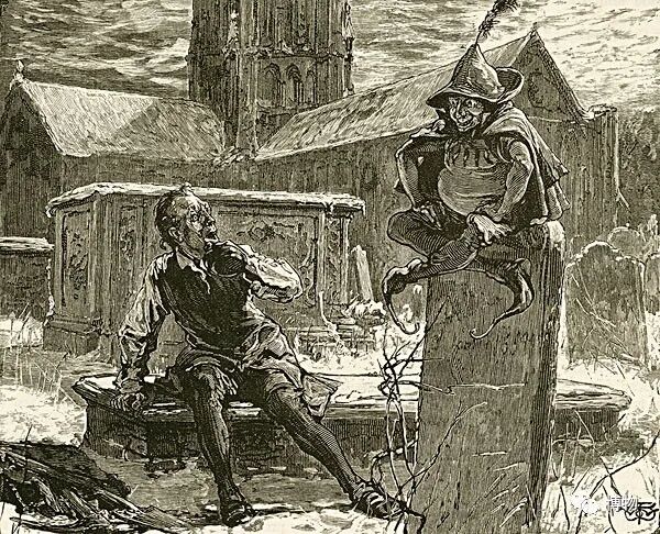 一幅19世纪英国小说的插画:醉醺醺的教堂司事在平安夜里为死者挖掘墓坑,一只哥布林突然出现在他面前。图中的哥布林矮小丑陋,并像英伦传说里那样戴着尖顶帽。