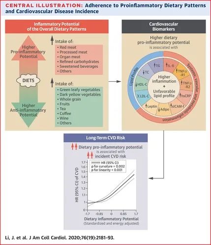 研究者指出,炎症在动脉粥样硬化和血栓形成的过程中发挥关键作用。该研究表明,健康饮食模式可能通过控制慢性炎症,来降低心血管病发生风险。该研究结果如经进一步证实,少吃促炎食物,可预防心血管病。该研究分析了近20万没有心血管病和癌症的美国居民,每4年随访一次。随访5,291,518人年后,15 837人患心血管病,其中9794例为冠心病,6174例为中风。[1]中华预防医学会, 中华预防医学会心脏病预防与控制专业委员会 , 中华医学会糖尿病学分会,等. 中国健康生活方式预防心血管代谢疾病指南. 中国循环杂志, 2020, 35: 209-230.[2]Dietary Inflammatory Potential and Risk of Cardiovascular Disease Among Men and Women in the U.S. . J Am Coll Cardiol, 2020, 76 (19): 2181–2193.[3]Ideal Dietary Patterns and Foods to Prevent Cardiovascular Disease: Beware of Their Anti-Inflammatory Potential. J Am Coll Cardiol, 2020, 76 (19): 2194–2196.