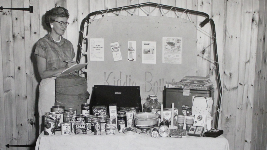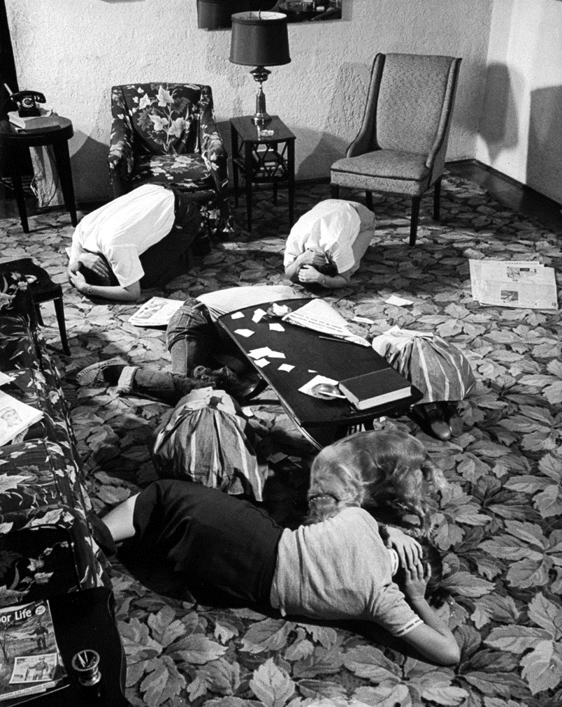 在这种氛围下,各种应急物资,各式各样的避难所以及随之深埋的恐惧成为了五六十年代美国民众的集体回忆。 古巴导弹危机期间关注电视新闻的美国民众,现在的我们或许很难体会这种紧张 如今,那些防空演习频繁进行,“大新闻”呼之欲出,来自古巴的导弹随时可能扬起蘑菇云的日子早已随着冷战的结束而尘封。但这份记忆仍然给美国人民留下了深刻印象,“仿佛原子弹明天就会落到我们头上。” 《辐射》游戏中推销避难所计划的电视广告,注意衣食起居风格仍然停留在冷战时期 例如,提到对核战争以及战后余生的设想,就绕不开大名鼎鼎的《辐射(Fallout)》系列游戏。虽然游戏中的核战争爆发于2077年,但是整部作品中的建筑,衣着,装饰和音乐风格似乎都停留在美国20世纪五六十年代。爵士乐,瓶装可乐,肌肉车(残骸),笨重庞大的计算机,当然,也少不了美式幽默和星罗棋布的大型避难所… 一切都透露出浓浓的“核战古早味”,而这都源于那段空前恐慌的岁月。 《辐射》系列游戏中的避难所计划宣传画,明显承袭五六十年代艺术风格 我国民众虽然没有经历过核战威胁下的极度恐慌,但在人防工事的建设方面却始终没有掉队。早在1951年,我国就成立了人民防空办公室。根据不同时期国内外局势,我国人防建设也呈现不同的特点。 抗战期间,日军的空袭曾对我国军民造成了严重伤亡。基于这种惨痛经验,1953年,全国人防第一次会议认为不能等到打仗时候再修工事,和平时期就要操着心。我国早期人防工程的建设,在“长期准备,重点建设”的方针下拉开了序幕。