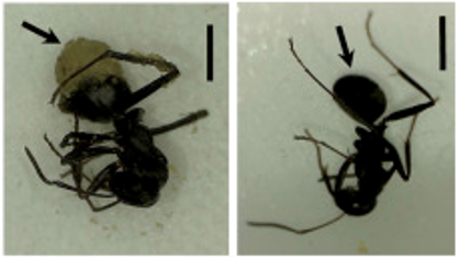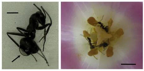(左)涂了胶水的蚂蚁,腹部沾满了花粉;(右)没有涂胶水的蚂蚁,几乎没有沾上花粉 | 参考文献[1]
