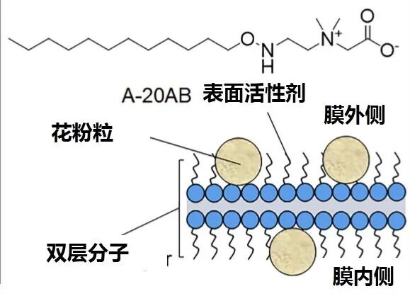 泡泡中表面活性剂形成双层分子,将花粉推到泡泡膜的表面 | 参考文献[3],汉化:圆的方块