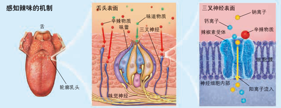 辣味是一种不可思议的感觉,有时感觉像痛,有时感觉像热。辣味是可以由舌头感知的,但实际上却属于和味觉不同的感觉。人的基本味觉有5种(甜味、鲜味、咸味、酸味和苦味),这些味道的成分都可以通过舌头表面叫做“味蕾”的部位感知到。味蕾的细胞表面有被称为“味觉受体”的感受器,这些感受器检测到味道成分后,“味觉神经”开始兴奋,将味道信息传递给大脑。除此之外,检测辣味成分的辣椒素受体(称为TRPV1的蛋白质)位于味觉神经以外的神经(三叉神经)的表面,辛辣物质附着到这里后会向大脑传递辣味信息(下图)。也就是说,味觉和辣味是完全独立的两种不同的感觉。通常的味道是通过舌头表面凸起的“轮廓乳头”上像花蕾一样的器官(味蕾)来感知的。但辣味不是通过味蕾,而是通过“三叉神经”表面的辣椒素受体来感知的。辣椒素受体的形状像门一样。这个门平时是关着的,和辛辣物质结合后就会打开(这个状态称为激活)。这样,神经细胞外面的阳离子(钠离子和钙离子)就会进入到神经细胞内部,使神经兴奋,把辣味信息传递给大脑。但这两种感觉的信息最终都会集中到大脑,因此,辣味的感觉会影响味觉。大家在吃非常辛辣的食物时,是否会觉得已经感觉不到辣味以外的其他味道了?这是因为,辣味太强烈的话,味觉就会变弱。拉面等有调料的食物中加入辣味的话,虽然盐量减少,但却能补充“咸味”。虽然都是辣味,但有的入口瞬间就能感觉到,有的慢慢才能感觉到。为什么会有这种不同呢?辣味的特征由两个要素决定,一个是“亲油性”,另一个是“激活辣椒素受体的能力”。具有辣椒素受体的三叉神经位于舌头内部向里一点的位置。因此,要感觉到辣味必须等辛辣物质进入到舌头内部,所以食物进入到口中要经过一会儿才能感觉到辣味。舌细胞的表面由称为“脂质”的油性成分构成,因此,越是亲油性的物质越能更快通过细胞进入舌头内部。辣油这种将辛辣物质溶于油的食物会很快使辛辣物质到达辣椒素受体,因此一入口很快就会感觉到辣味。研究结果显示,辣味的成分不同,使神经细胞兴奋的能力也不同。辣椒素受体的形状像一个门,这个门平时是关着的,当和辛辣物质结合后,它的形状会发生微妙的变化,使这个门打开(激活)。这样,神经细胞外面的钠离子等阳离子就会进入到细胞内部,使神经细胞兴奋。辣椒素受体可以和辣椒中所含的“辣椒素”、山椒中所含的“山椒素”以及胡椒中所含的“胡椒碱”相结合。这些成分和辣椒素受体结合的强度各不相同,越是能强烈结合的成分就越会强烈激活辣椒素受体,从而让人感到更强烈的辣味。除了辛辣物质以外,43℃以上的温度也会激活辣椒素受体。越是热的食物觉得越辣,就是因为辣椒素受体会被辣味物质和温度这两方面的因素激活。在吃辛辣食品时喝冰水,会在一瞬间使辣味变弱,但不能完全使辣味消失。这是因为通过喝水可以使由温度激活的辣椒素受体活跃度降低,但非亲油的水并不能冲洗掉进入舌头内部的辛辣物质。牛奶等冰凉并且亲油的饮料可以有效减轻辛辣的感觉。吃辛辣食物会给身体带来各种影响,最有代表性的变化就是身体感到发热或是出汗。但实际上,吃辛辣食物时,身体的温度并不会上升。除了舌头以外,辣椒素受体同时存在于胃、肠的神经。因为辣椒素受体在43℃以上的温度时会被激活,因此,辛辣物质激活体内的辣椒素受体时会使身体产生错觉,感觉像是全身发热(灼热感)。除此之外,吃了辛辣食物后,位于消化管神经细胞的辣椒素受体被激活,会引起交感神经活跃,从而使人出汗。出汗后皮肤表面温度会下降,因此吃了辛辣食物后,实际上体温反而会下降。