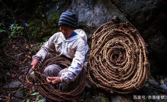 采蜜人家族还有一个从不外传的技艺:做绳索,这种绳索形状类似梯子的形状且格外牢固。因此在尼泊尔采蜜人中承担这项职务的女性在家族中的地位也比较高。图片来源/腾讯网