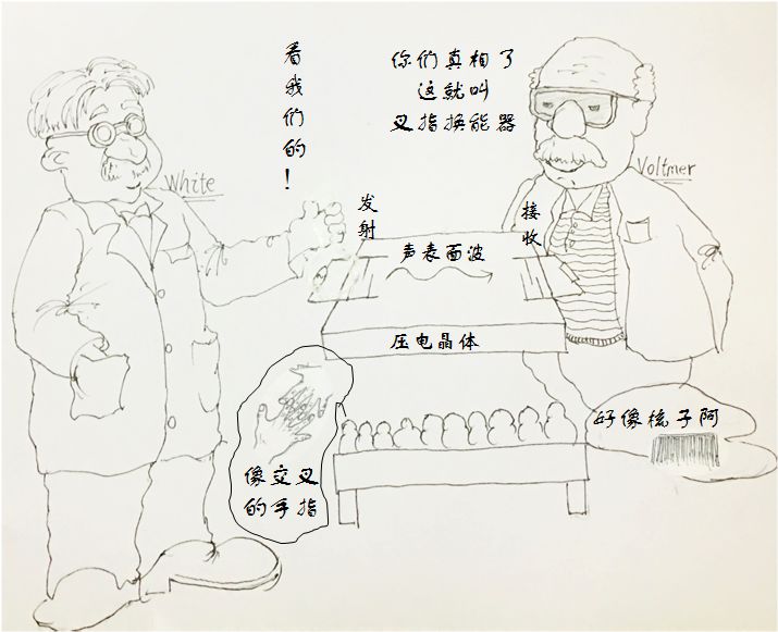 科学家在具有压电性能的晶体表面,做上周期性正负相间的金属电极,然后给电极加上很小很小的电信号,就能在晶体表面激发出能被我们控制的声表面波。这个沿着晶体表面传播的声表面波很微弱,弱到人们都无法直观感觉到,如果在它的传播路径上摆放一个周期相同的电极,当声表面波传到这个电极处的时候,科学家就能将它捕获,并转化成方便处理的电信号。