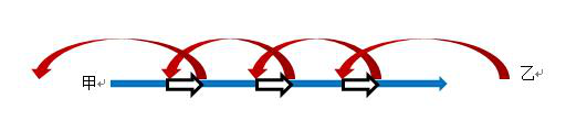 这时候就要给设定打补丁了,比如日本科幻作家梶尾真治的短篇小说《时尼的肖像》(刊《科幻世界》2007年第5期)是这么补的:“他们以二十四小时就会向过去回溯一天。所以,他们并不是像我之前想象的那样,连走路、说话的方式都是逆反的。”这样,甲乙相遇时,时间方向还是一致的(白箭头)。