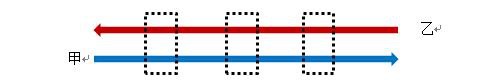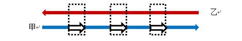 更复杂一点的情况是连续时间相遇:甲从过去连续地到未来(蓝箭头),乙从未来连续着到过去(红箭头);途中他们可能也见了三次,说几句话(黑虚线框)。当然这里就能看出问题了:那甲可能完全听不懂乙说话!因为在甲看来乙是倒着说的。