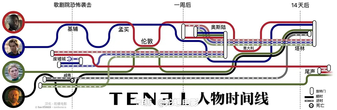 不得不说,诺兰对这个传统科幻模型所做的创新极其有限:他只不过是增加了两种时间方向的变化次数,只不过是增加了人数——简而言之,都是数量上的,而非结构上的。但是这些变量纠缠在一起能导致本片的模型复杂程度指数级暴涨,真是一团乱麻,我都不想画了。网上有很多图,在这里借用一下,来源见水印。