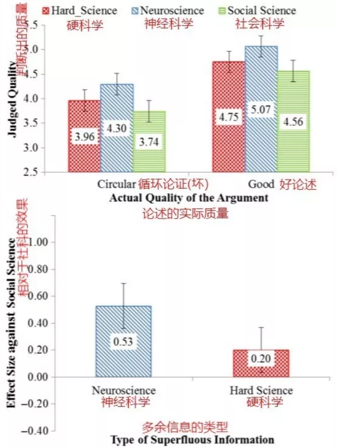 为什么会这样呢?脑部扫描的神经成像发现,这种“诅咒”的发生是因为额叶脑回路与自我认知有关。人们被要求对别人做出判断的时候会出更多错,他们更擅长判断自己[1]。 ——如果你觉得上边的解释看起来好像还挺有道理,那恭喜你也被骗了。知识的诅咒确有其事,但上边的神经科学信息和它半毛钱关系也没有。不用难为情,事实上,大部分不了解神经科学的人、甚至一些学习神经科学的大学生也一样上当了。 神经科学会引诱谁? 上边讲的案例来自一则心理学实验。曾在宾夕法尼亚大学任教的认知科学教授狄娜·韦斯伯格 (Deena Weisberg) 和同事随机分配给被试者们针对某种现象的高质量解释、低质量解释,以及在二者中插入不相关神经科学信息的解释,然后让被试给这些解释的满意程度打分。 她们发现,当神经科学被拿来当作佐证时,人们仍旧能够区分论述的好坏,但质量很差的论述在人们眼里就立刻变得没那么差了。这种现象被称为“神经科学的引诱” (seductive allure of neuroscience) [1] 有趣的是,实验中一些已经修完一学期认知神经科学课程的大学生会给质量高、但没有神经科学佐证的解释打比普通人更低的分[1],甚至一些学生说“在阅读当中,他们把神经科学的出现作为判断一个解释的好坏的重要标志之一”[2]。但当实验对象换成一些神经科学领域的专家时,专家们则能准确判断论述的好坏而不被不相关的神经科学信息影响[1]。 所以别再相信你那些学了一年神经科学就开始跟你“科学”地解释一切的朋友了,他们自己都分辨不了对错。 为什么你会被骗? 心理学家对这种现象提出了很多解释。其中有人质疑这种“引诱”并不是因为神经科学的出现,而根本是因为文本长度的作用——实验中插入了神经科学的文本比没插入的文本更长。一些研究发现,也许是因为更长的解释看起来更复杂、更难以理解,我们确实会觉得更长的解释更有说服力[1]。但后续实验控制了两种情况、使文本长度保持一致之后,“神经科学的引诱”还是出现了[2]。 也有人认为神经科学之所以能有如此巨大的迷惑性,是因为它被看作是更“硬”的科学[3],读者被神经科学迷惑,实际上是被神经科学自带的那种不容置疑、看似更科学的权威性引诱。在科学界,鄙视链一直是存在的。社会科学一直被从科学领域划分出来,心理学也经常被质疑不具备作为一门真正的科学的资格。 心理学家们设计了新的实验,分别在同样的解释文本中插入社会科学、“硬科学”(例如遗传学、化学),以及神经科学的信息。比如,同样是解释“知识的诅咒”,神经科学的文本会提到额叶脑回路和自我认知,社会科学的则会说“在相互依存的社会中成长起来的个体的自我认识是共同发展的”,而“硬科学”就会提到“自我认知与DNA结构的表观遗传变化有关”。 他们发现,插入神经科学信息时的引诱作用明显高于社科和“硬科学”,但“硬科学”的效果并不比社科强多少[3]。 插入神经科学信息时的引诱作用明显高于社科和“硬科学”,但“硬科学”的效果并不比社科强多少丨参考资料[3] “硬科学”的解释效果并不太好,可能是因为人们并不觉得心理过程能直接简单地被遗传学、化学解释。但是,很多人却盲目地确信“大脑是意识过程的引擎”,甚至有很大比例的人错误地相信“对大脑的研究发现,是对心理过程表象下的生物本质的解答”[3]。 大脑无法带来那么多答案 实际上,人们步入了极其危险的误区。 对大脑的研究的确能在一定程度上帮助我们理解心理过程,但当下的神经科学发展还处在极其不成熟的阶段,而且对心理的研究并不是一定需要我们足够了解大脑。一个常见的类比就是,大脑就像是电脑硬件,而心理就像电脑软件。虽然了解电脑硬件可以让我们清楚地知道对运行于其之上的软件的限制,但不了解硬件并不影响我们全方面地理解甚至熟练地运用软件。一些心理模型尽管复杂,但却能最准确地描述我们目前对心理机制的理解。 韦斯伯格教授又做了后续实验,发现这种“神经科学的引诱”在一定程度上就是一种“简化的引诱”[4]。她们发现,人们容易把社会问题简化为个体心理问题,把个体心理问题简化为大脑问题,把大脑问题简化为生物问题等等[4]。人们总想用一个更简洁的“定理”去解释纷繁复杂的表象,这本身没有错,毕竟科学就是找出事物背后的规律。但这种惯有的捷径有时会引起巨大的偏差,尤其是在神经科学如此稚嫩的情况下。 骗了你,也能骗更多人 在大众媒体中,某些标题的滥用——诸如某些药物/行为会“改变你的大脑”等类似说法——从一个侧面既说明了神经科学信息是多么的吸引人,也反映了大众对神经科学的真实了解少得可怜。这些滥用、误用,会让“神经科学的引诱”更加恶化,在传播上加重一种偏倚的科学本质主义。 当人们产生了简化繁杂现象的冲动时,从一个微小的认知偏差出发引起的实际问题可能是难以想象的。以神经科学为基础的证据,已经被辩护律师用来左右法庭上陪审团的意见,并以此来改变案件的审判,而鉴于这类信息本身带有的巨大迷惑性,这样的证据很有可能引诱陪审团和法官做出不恰当的决定,从而潜在地威胁司法系统的公正。 在心理学家设计的模拟谋杀案实验里,当以精神分裂症等精神疾病的确诊作为辩护证据时,如果证据中包括科学家以神